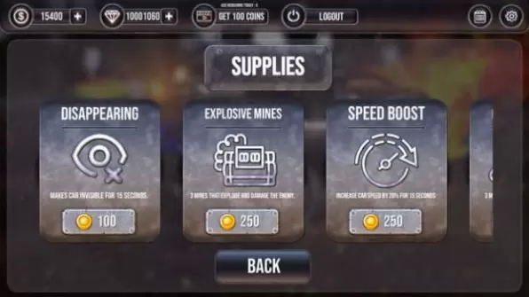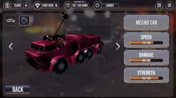 2、尽量升级你的车,安装更强大的武器增加攻击力,让你瞬间摧毁对手的车;