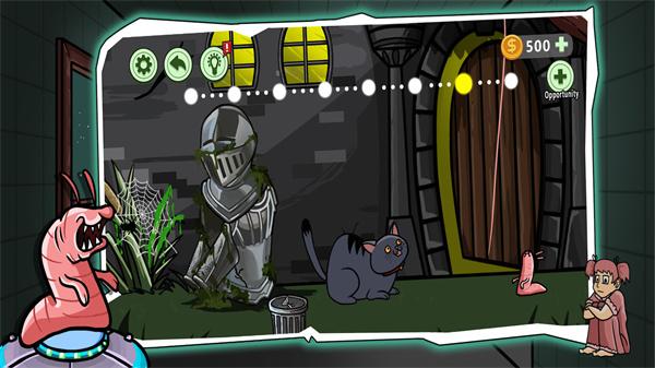 3、点击门把手,猫来,点击蜘蛛网,点击烂苹果,虫吐,猫走,点击猫,猫又来,点击门上树影,进入洞,单击第一个按钮。
