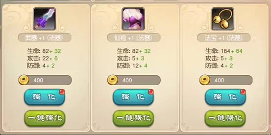 主角拥有3件装备,每件装备增加3项属性,分别为攻击、防御、生命。消耗金币可以强化装备,每次强化提示装备等级+1并增加装备属性。每强化装备10次需要进行突破,突破消耗突破石,突破之后提升大量装备属性并提升装备品阶,并且可以再次强化装备10次。镶嵌宝石