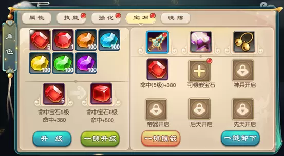 当主角的装备强化到“仙器”品阶时,会开启镶嵌功能,每件装备最多镶嵌6个宝石,可镶嵌宝石数随着装备品阶的提升而增加。将低级宝石合成高级并镶嵌在装备上便可提升战力。每个宝石增加的属性不同,合理搭配能够事半功倍哦。装备洗炼
