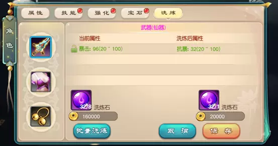 当玩家等级达到32级时开启装备洗炼,消耗洗炼石和金币可以对装备的附加属性进行随机洗炼,属性随机的区间显示在每条属性的后面。一件装备可以拥有多个洗炼属性,洗炼属性的数量随着装备品阶的提高而增加。洗炼之后的属性必须保存才能生效,一定不要忘记哦!