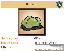中毒是饥荒的一种新的游戏机制,如果玩家被毒性生物或在中毒的环境中受到伤害,玩家就会中毒,中毒之后玩家会缓慢损失生命和理智,中毒会在3个游戏天数之后自动治愈,玩家也可以使用解毒剂解毒。玩家也可以使用毒腺进行解毒,不过会造成75点伤害,但是不会致命,至少会留有5点的生命值,所以当中毒成为致命伤害时,可以考虑使用毒腺解毒。
