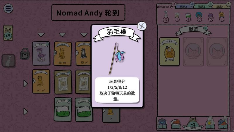 猫女作为一款好玩的休闲游戏,你和你的猫女好友一回合可以抽3张牌,把玩具、食物、猫薄荷、服装,当然还有可爱的猫咪们通通收集起来。不过你要小心!一定要确保有足够的食物来喂猫,不然会被扣分。