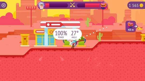 游戏最考验玩家的地方就在操作方式上,想要精确的射中对方绝对不是一件易事。玩家需要上下滑动屏幕来调整射击角度,接着还要向后方滑动进行力度的调节。让人感到庆幸的是,每一次调整屏幕上都会显示出角度和力度的数值,玩家可根据这些数值在后面的射击中逐渐进行纠正,直到射中对方。而且,由于射击部位的不同也会产生不一样的伤害效果,直接爆头是最有效的一种攻击方式。