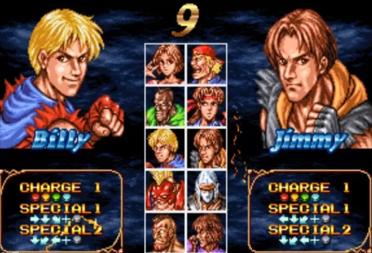 熟悉的音乐响起,两条张牙舞爪的龙盘旋在一起,伴随着几道电闪,“双截龙”三个遒劲有力的字出现在屏幕上,双截龙这个词语和魂斗罗一样,是字典里面所没有的,输入法里面也找不到,要是哪个学汉语的老外看见这个词语,去翻字典的话,那将永远也查不到。偏偏在特定人群之中,例如我们游戏者,是最最熟悉不过的词了,想当年刚看到屏幕上出现这三字的时候,街机房里也有过各种叫法,有人说双战龙,有人说双戏龙,还有人坚持认为是双载龙,最后才知道应该是双截龙,至于为什么这个“截”字肚子里面是一个“金”字,问了好多人都不知道,大概不是日文汉字就是异体字吧..