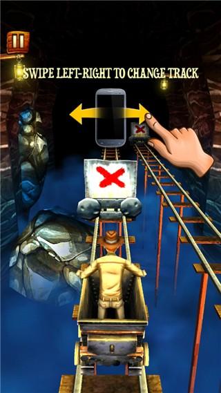 1、你乘坐着小矿车在轨道上奔跑,你能坚持多久?滑动你的手指,让小矿车跳动起来,并且收集更多的宝藏吧.