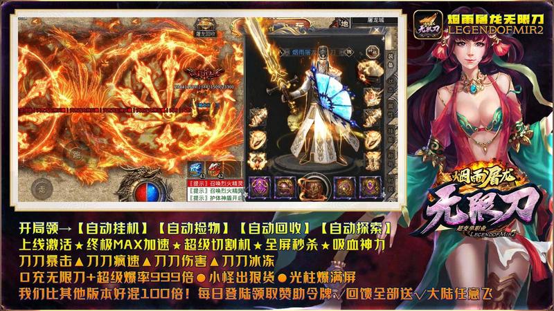 烟雨屠龙无限刀是一款开局就送各种炫酷时装的传奇手游,在这款烟雨屠龙无限刀手游当中,你不仅可以轻松获得各种稀有材料,并且将这些材料合成为各种增幅药水,除此之外,游戏中还有各种奇遇任务等你来完成,只要顺利完成任务,就可以让你获得各种稀有道具。感兴趣的小伙伴快来下载试试看吧!
