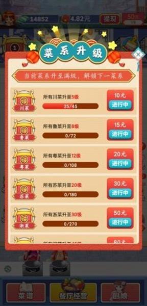 菜谱与食材十分丰富,随着游戏时间的推移,餐馆等级的提升,菜谱与食材的数量将会不断增加。