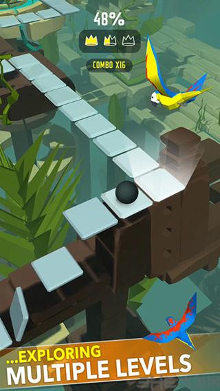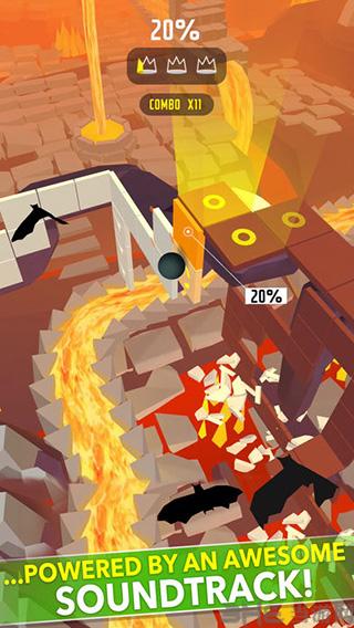 b.每个关卡都是在你眼前建造的迷宫。要想预测接下来会出现什么,以及对蜿蜒曲折的形势做出反应,你必须仔细听音乐。旋律的节奏是游戏内容的关键。