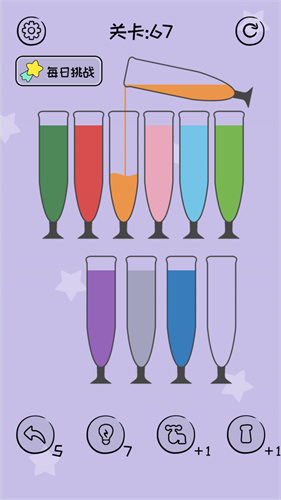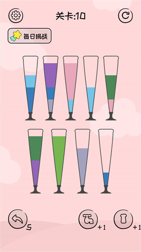 1、这是一款休闲益智游戏,游戏的风格很简单,杯子里装满了很多颜色。