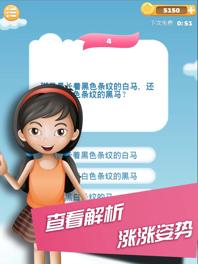 海量题库:涵盖各种领域的问题,从历史地理到流行文化,应有尽有。多种游戏模式:单人PK、多人对战、团队合作等多种玩法,满足不同玩家的需求。精美界面:清新简洁的游戏画面,让你沉浸在愉快的游戏体验中。实时排行榜:与全球玩家一较高下,争夺排行榜榜首的荣耀。社交互动:与好友组队答题,一起挑战高难度问题,增加游戏乐趣。游戏玩法: