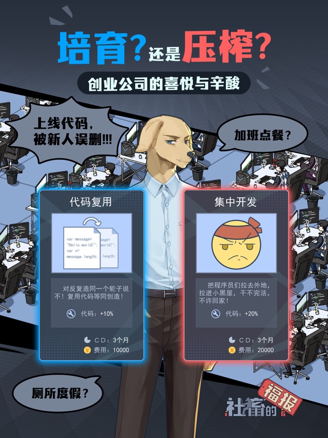 《社畜的福报》是一款深度探索互联网行业创业者心路历程的互动剧情游戏。玩家将跟随主角经历创业的种种挑战与机遇,体验从草根起步到成为业界翘楚的奋斗过程。在这个真实而残酷的世界里,梦想与现实交织,困境与希望并存。玩家需要在复杂的商业环境中做出决策,解锁不同剧情走向,探索各种可能的结局。