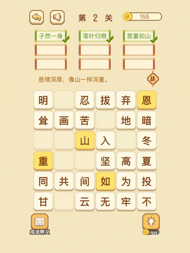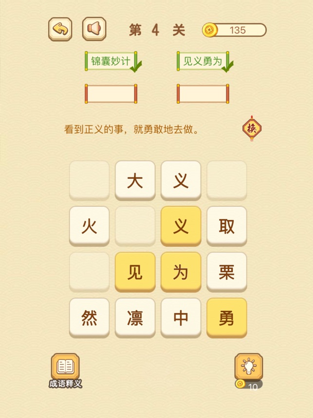 独特的成语消除玩法,让你在游戏中学习成语知识。海量的成语库,让你不断学习和掌握新的成语。多种关卡模式,包括限时挑战、无尽模式和解谜模式,让你享受不同的游戏体验。精美的游戏界面和音效,让你沉浸在成语的世界中。丰富的奖励系统,完成任务和挑战可以获得丰厚的奖励,提升游戏乐趣。游戏玩法: