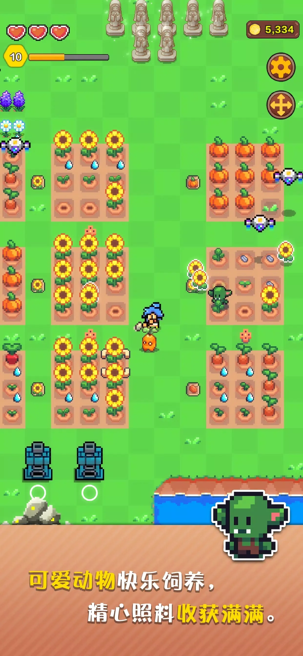 海岛时光种田挖矿单机版游戏内创建了一个属于你自己的农田,开局有一片萝卜田,玩家需要为萝卜浇水,然后采集萝卜买前或者储存着,然后在有钱之后就可以继续购买农田,修建一些房屋和招募一些小精灵或者无人机之类的帮助我们打理农田,一步步升级,慢慢解锁,还有采矿和钓鱼玩法,像素画风,舒适感较强。