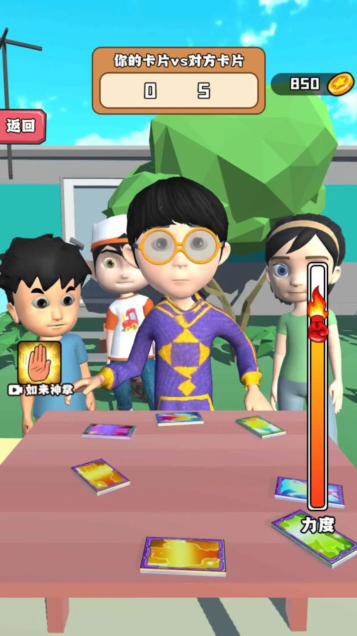 这是一款3D休闲益智游戏,游戏中你需要点击屏幕控制拍卡力度,通过将桌面上的卡片拍翻来获得该卡片,而在对局中谁拍翻的卡片数量比较多即为获胜者,对局胜利后玩家即可获得卡片和一些游戏货币,玩家可以通过与对手对决来获得各种卡片,货币还可以进行抽卡,让我们一起来体验一下吧!
