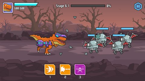 霸王龙大战机器人是一款以打怪闯关为主要玩法的游戏,共设有五个小关卡。在游戏中,玩家需要培养霸王龙与机器人进行激烈的战斗,并通过合成机制来提升霸王龙的属性,使它们变得更加强大。游戏中还有多种玩法。玩家可以制作新的装备来提升实力,并解锁更多特殊能力。