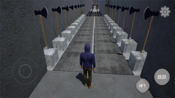 2、按照屏幕上提供出来的操控按键,点击使用移动角色前进,利用蹲下以及跳跃的动作按键,来躲避设置的各种陷阱与障碍物。
