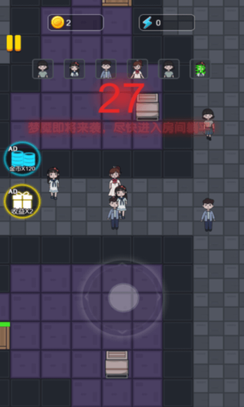 整个游戏过程都十分的激烈和刺激,需要利用自己的智慧和策略来躲避魔鬼的追捕,从而使自己获得安全。游戏操作十分的简单,将所有猛烈攻击我们宿舍的全部猛鬼进行消灭,保护人类的安全,并且在战斗过程中不被魔鬼抓住。