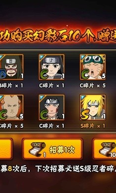 3.不断招募,一定能送出s级忍者的碎片,模拟实际抽卡不要错过。