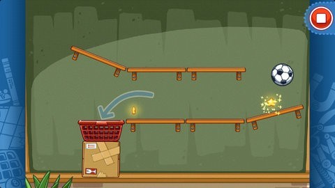 在第二关中我们就开始需要使用游戏提供的第一个道具了,一张长板凳。通过以下第二关的游戏画面我们可以看到在足球通往篮子的图中少了一截,怎么办呢?不用担心,只需将右下角的道具板凳拖到游戏图中指定位置就行了,放好之后就可以让足球顺利通行到达篮子中了。