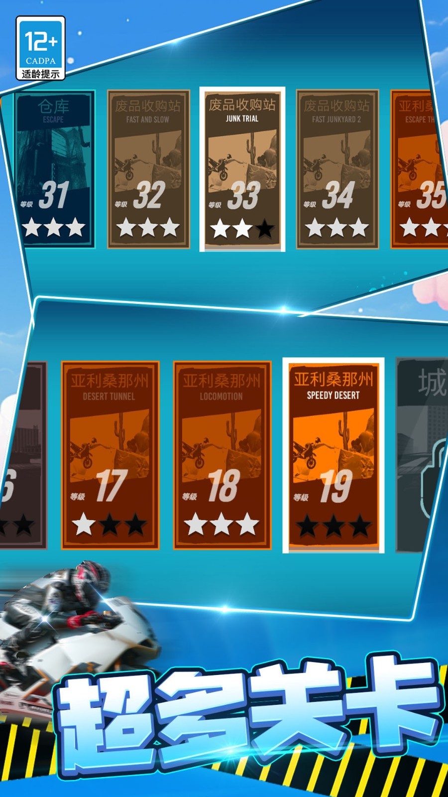2.只有真正的勇士才能征服所有关卡,赢得三星评价,成为无人驾驶摩托界的传奇