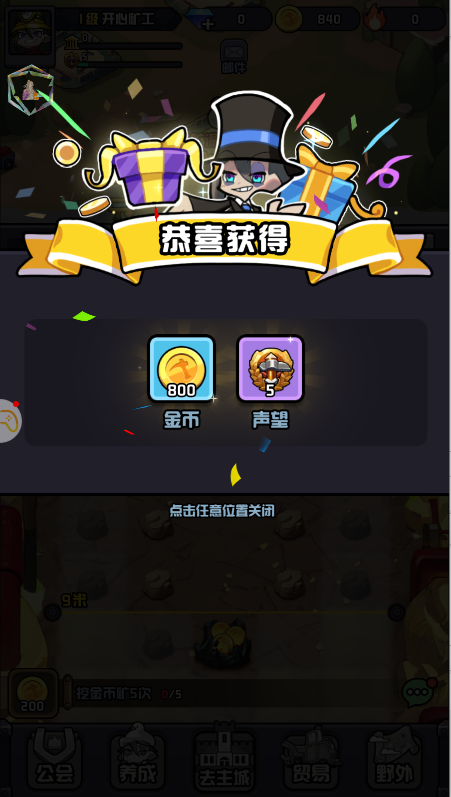 1、进入开心小矿工主界面,点击矿石,挖矿获取金币等资源奖励