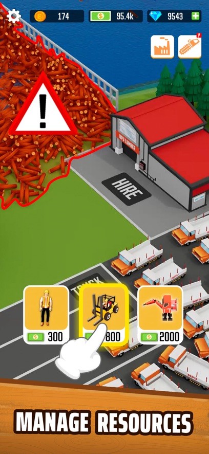 2、游戏操作简单,主要涉及挂机赚钱。你可以在零碎的时间里上线,雇佣工人,看着木头被砍伐、剥皮、运输和制作。每个环节都需要不同类型的工人,你需要通过培训来提升他们的技能。此外,还需要投入经费进行木头研究。