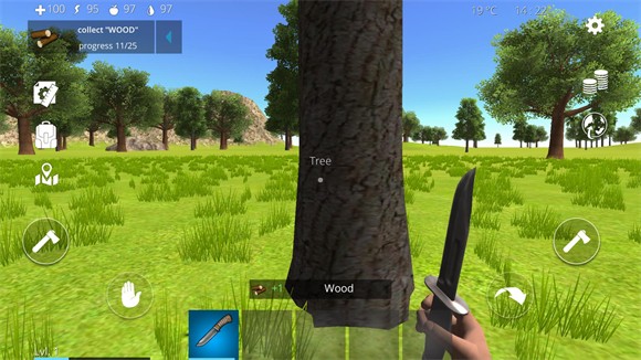 8、我们沿着海岸线朝着水塔走去,在路上可以用匕首对着树干,然后点击右侧“拳头”攻击按钮,可以获得木头,这是后期生存所必备的材料