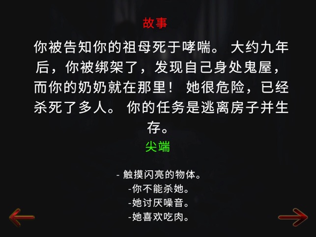 奶奶对噪音极其敏感。 不过她从不睡觉,吃过生肉后她还能忍耐一点。 目标是想方设法避开她并逃离鬼屋。