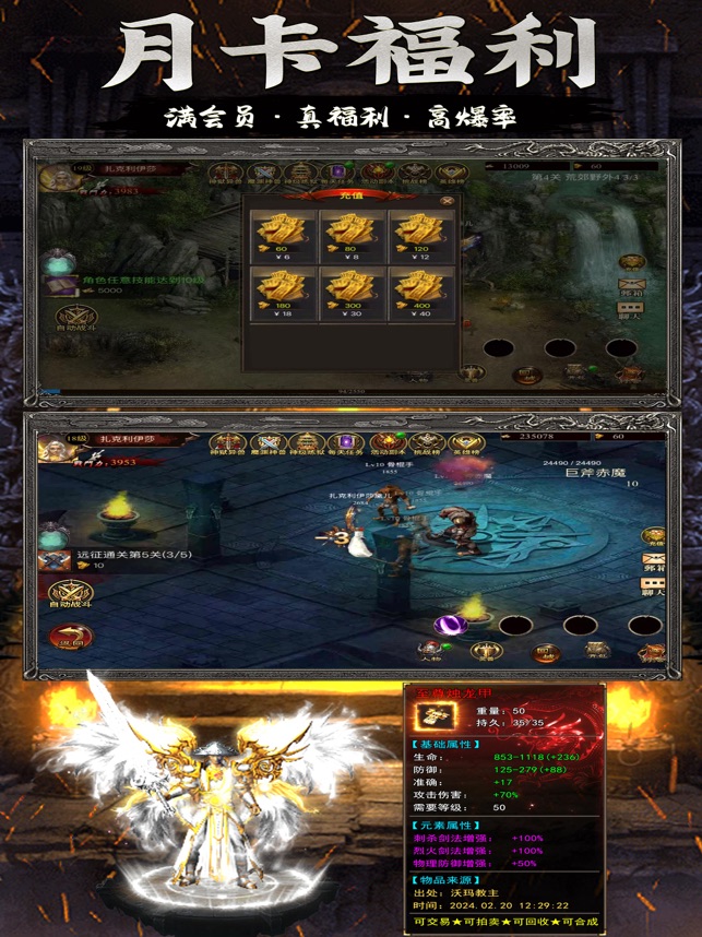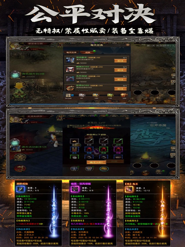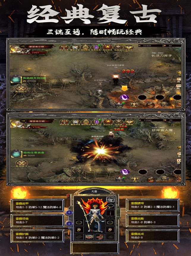 复刻经典的三职业打金神器玩法,原汁原味重现“散人打金”、“刀刀升级”、“装备回收”、“PK爆装”、“激情攻沙”的核心玩法。美术画面上,既在场景角色上忠于老传奇的复古风格,又在技能和道具特效上有所突破,武器套装的华丽,刀刀爆光柱的炫目,坐骑翅膀的绚丽,等着您来见证。