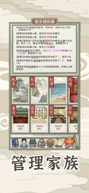 3. 处理家事 — 大至成年家人的仕途和生死,小至孩童抓周和考试,家族内发生着非常多样的随机事件要你着手处理,而你的每个选择也会影响家族的走向。