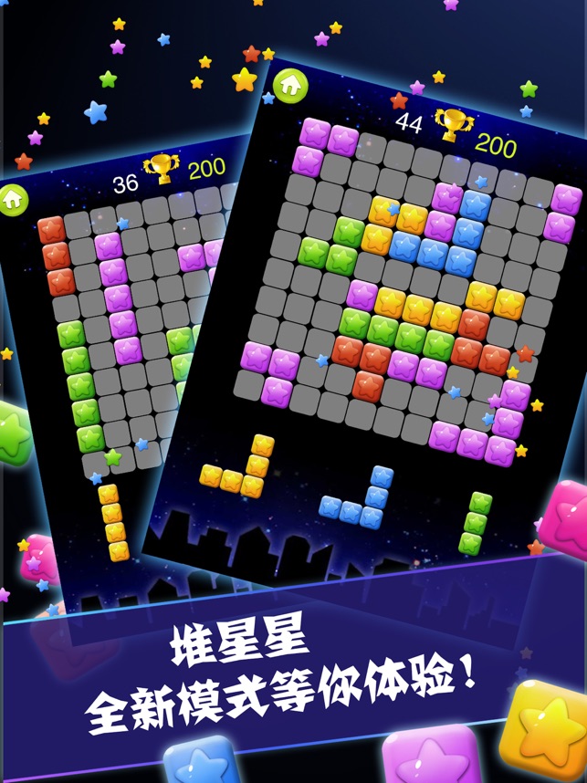 堆星星模式:将方块拖入格子中,堆满行或列就可以消除,易于上手难于精通!
