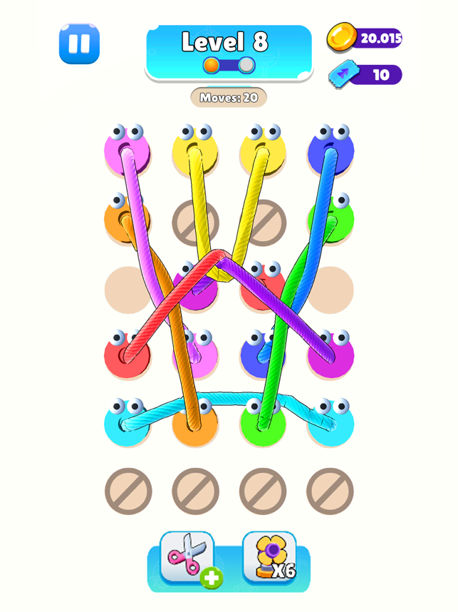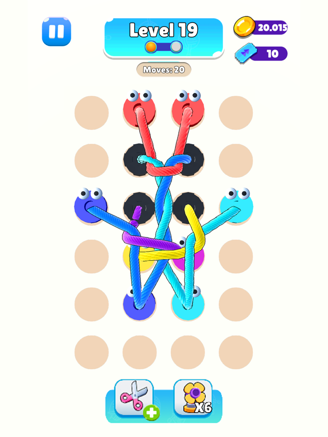 - 点击和拖动:移动绳索和大头针以解开每个结。