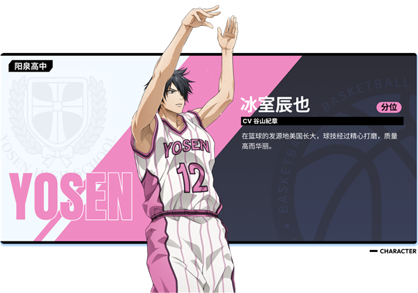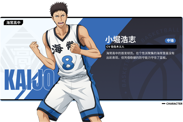 海常高中的首发球员。在个性派聚集的海常里虽没有出彩表现,但凭借稳健的防守能力守住了篮板。