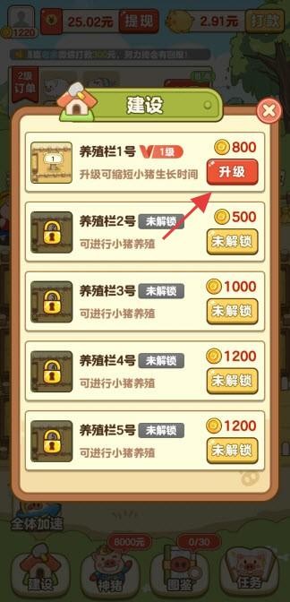 3、玩家能够在游戏的【建设】界面,升级养殖栏(如养殖栏1号),解锁新栏位,提升养猪场的养猪效率。