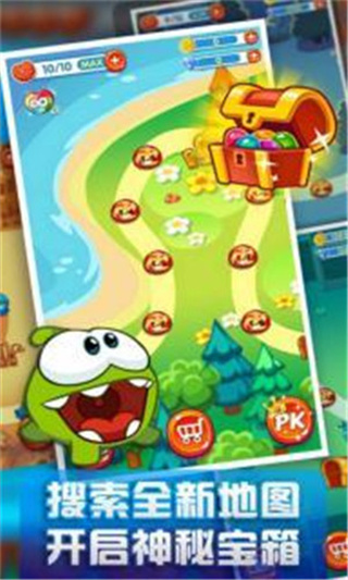 开启游戏后,玩家的主要玩法就是帮助可爱的角色吃到糖果,与小绿怪的角色进行游戏。这款游戏的与经典中不同的提升时添加了环境互动的游戏机制以及角色技能上的系统功能展现变化。挑战更丰富的挑战,玩家只需要点击屏幕上滑动就能隔断绳子,利用着重力,弹力,气流等等物理定律的方式解锁。让糖果成功的掉落下角色,Om Nom的嘴里,就能完成关卡。在关卡当中,系统还提供了各种技能,如喷气,拉物,尖端锁链等的技能,轻松完成了各种复杂的路线。