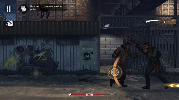 4、当遇到僵尸怪物后可以点击射击按钮来进行攻击,使用黄色按钮可以投出手榴弹攻击敌人。