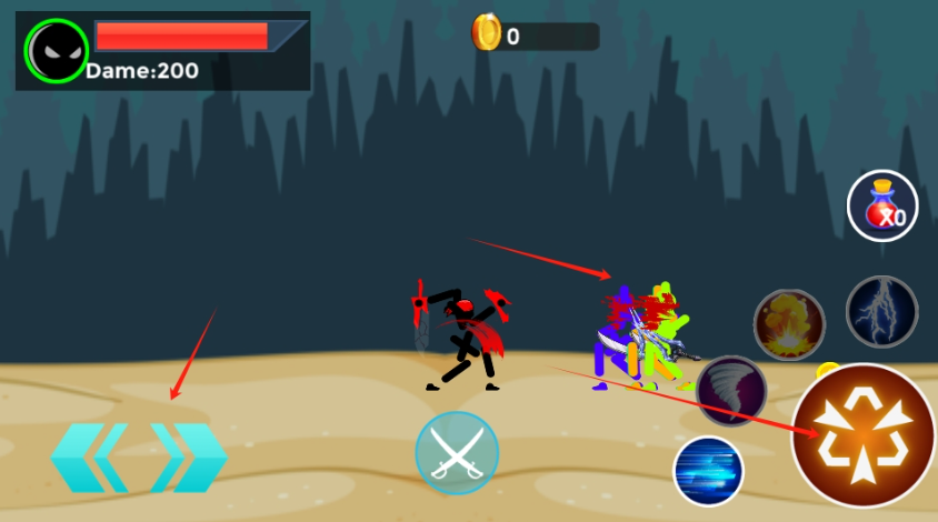1、玩家操控火柴人角色,在各类关卡和竞技场中与敌人展开激烈战斗,使用拳脚、武器和技能进行连击输出;