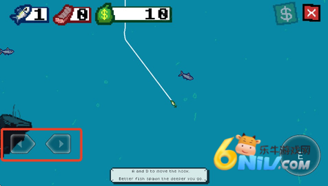 2、使用右下角的按钮控制鱼钩的方向。撞击到鱼后,对它造成伤害,达到一定伤害值后,就可以将它钓上来了,尽可能精准出击,才能最大化捕获数量。