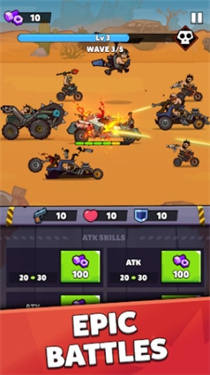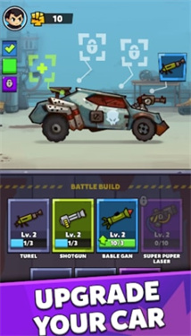 3.驾驶战车在沙漠关卡中移动,击败来袭的敌人,获取金币、钥匙、紫色零件等资源,用于后续升级。
