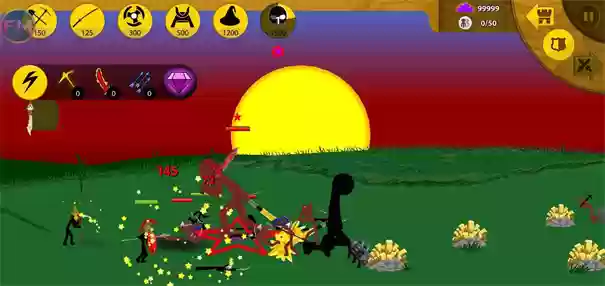 3、战斗中每一个士兵都需要一定的矿石才能召唤,如果挖矿的工人速度太慢,可以点击“闪电”记号,使用钻石来增加挖矿速度。这样我们就能快速获得足够多的矿石,用来召唤更多攻击性火柴人。