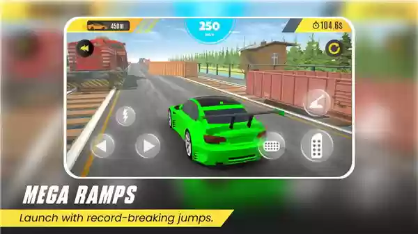 玩家将从选择赛车和配件后进入赛道,在坡道顶部开始俯冲并随着车速积累在跳跃点触发起跳动作。空中做翻转、螺旋或贴地飞行以成功完成动作并在指定区域着陆即可获得额外加成,赛道中还会设置障碍、机关和交通元素考验玩家在高速中灵活避开。完成关卡后就可以解锁下一个更具挑战性的赛道,且通过比赛可以取得奖励用于升级赛车性能、调整悬挂和装饰外观等。随着赛事不断提升,关卡的复杂度、障碍密度和特技难度都会有所提升。