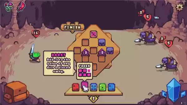 1.放入骰子后点击finish就可以使用骰子的效果,击败当前层数的怪物就可以前往下一层。