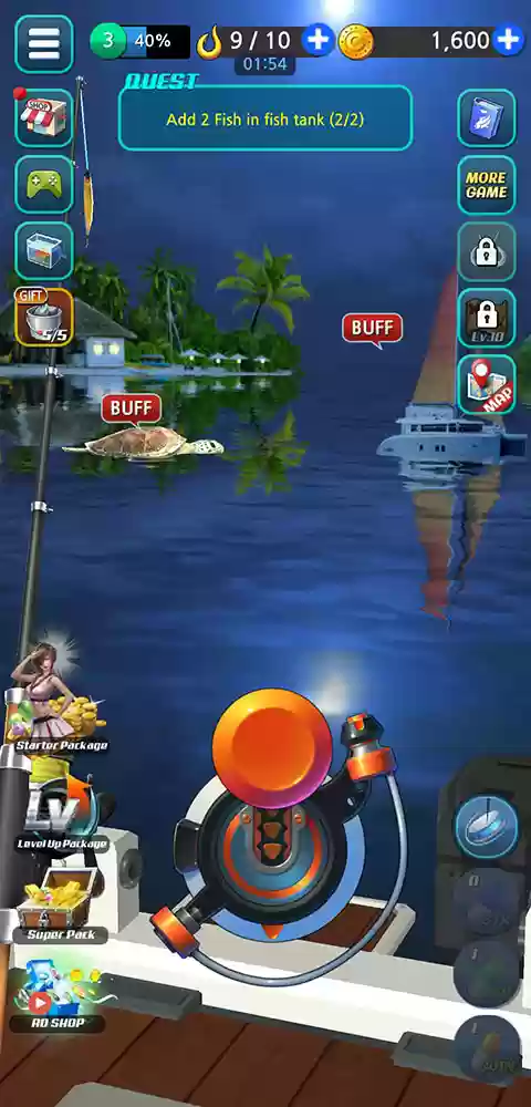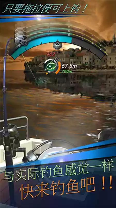 a.游戏有很多真实还原的场景,例如大海还有船和鱼钩,这里能够给予最真实的钓鱼体验,只需要简单的拖拉鱼就轻松上钩。