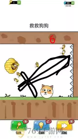 b.蜜蜂群就是喜欢把狗蛋蛰的满头是包,玩家需要动脑筋,为狗狗画一条线来阻隔。