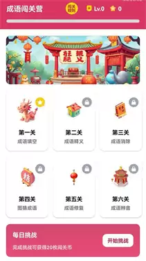 成语闯关营是一款考验玩家学习能力的休闲闯关手游,玩家将扮演一位热爱成语的闯关者进入一个充满古典韵味的成语世界。这个世界由多个主题岛屿构成,每个岛屿都是一系列精心设计的成语关卡。你需要通过填字、拼图、选择、连线等多种形式解答成语题目,修复被破坏的成语典籍,解锁新的区域,并结识历史上的文人墨客作为伙伴,共同挑战最终的“成语大师”宝座。