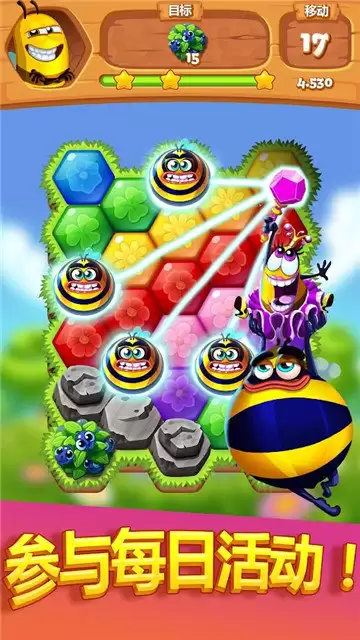 蜜蜂大爆发是一款很简单的休闲小游戏连击会有特效扩大消除的范围,并且画风还非常可爱,游戏中玩家需要将三只相同颜色的蜜蜂组合到一起进行消除,可以供玩家尽情挑战。