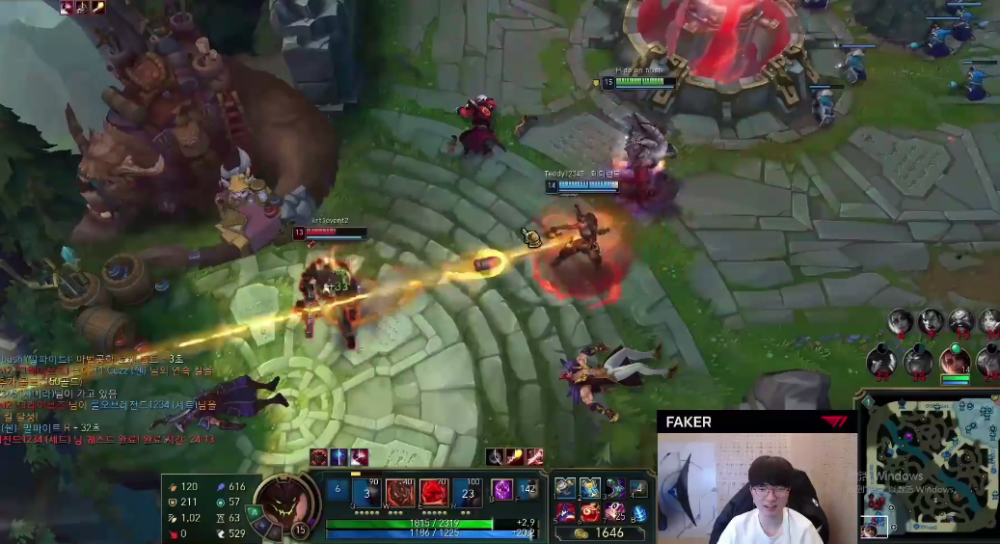 从双方选择的阵容来看,李哥是以娱乐的心态对待这场比赛:直接掏出了石头人中单对阵大司马的中单酒桶。游戏开始后,双方简单试探并分别送出了两个人头,但是在李哥六级之后T1开启了节奏发动机并带着大招来到下路帮助下路取得了优势。