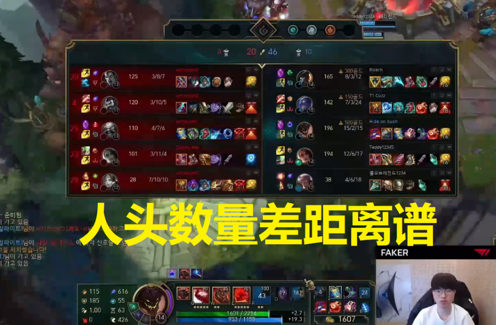 当T1靠着一波下路游走奠定了优势之后这支职业战队开始进行了游戏教学:急速支援、地图控资源、四一分带。虽然这些主播对游戏理解比普通人要深刻,而且T1这些战术也在比赛中多次使用,但是当这些主播真正面对T1时却显得心有余而力不足。短短24分钟,T1成功推上高地,人头也领先了恐怖的二十个,而仅凭李哥一人就拿下15个人头!