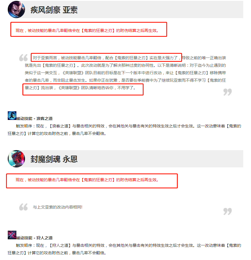 这次的改动中,亚索和永恩的被动效果,在鬼刀结算之后才会生效。这是什么意思呢?